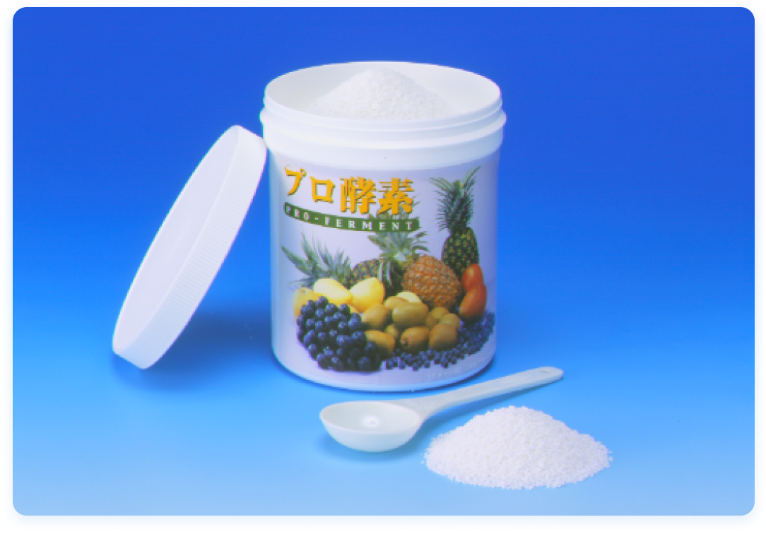 「プロ酵素」は、パイナップル、マンゴー、キウイ、梨、巨峰、ブルーベリーなどのフルーツから栄養分を特殊製法により抽出し顆粒状に精製したものです。